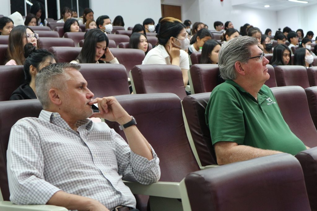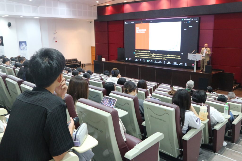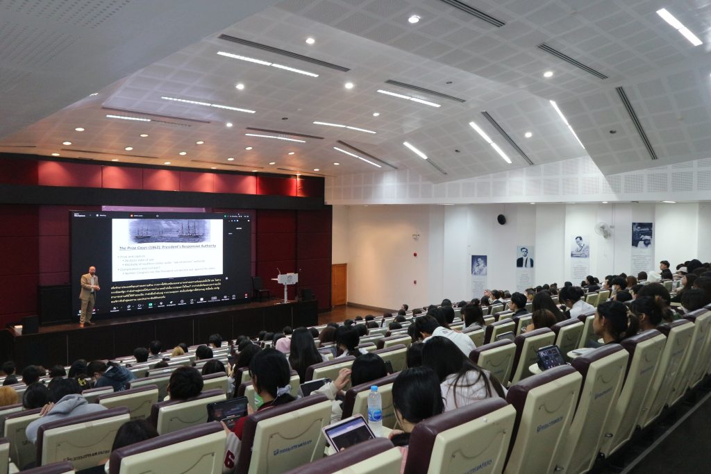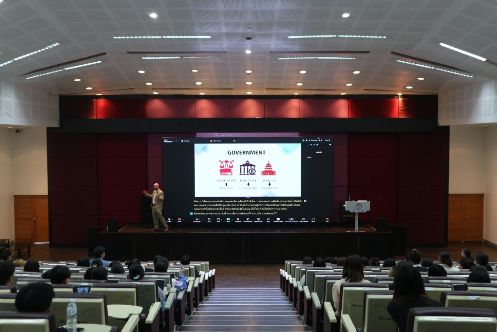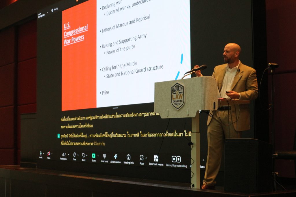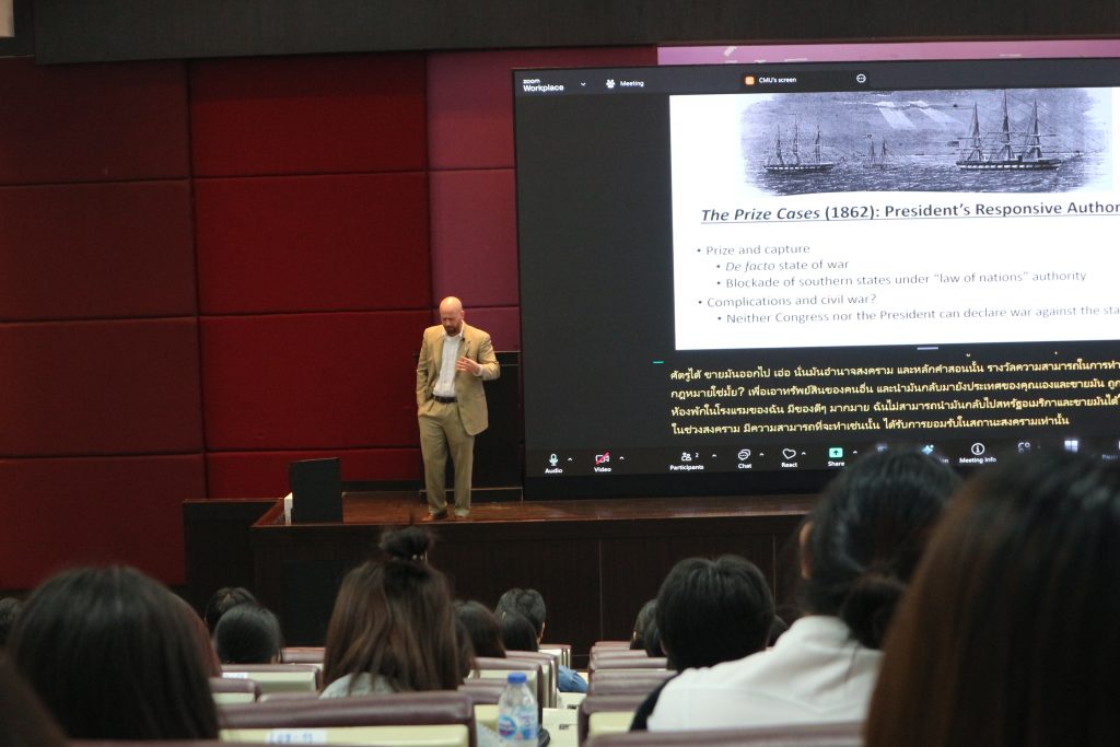 การบรรยายจัดขึ้น 2 ช่วง โดยภาคเช้า ณ ห้องประชุมใหญ่คณะนิติศาสตร์ ในหัวข้อ “History and Basis of U.S. Legal Restrictions on a President’s War Powers” บรรยายโดย Assistant Professor Dr. Dyllan Taxman ซึ่งนำเสนอพัฒนาการทางประวัติศาสตร์และหลักกฎหมายเกี่ยวกับข้อจำกัดในการใช้อำนาจทางทหารของประธานาธิบดีสหรัฐอเมริกา